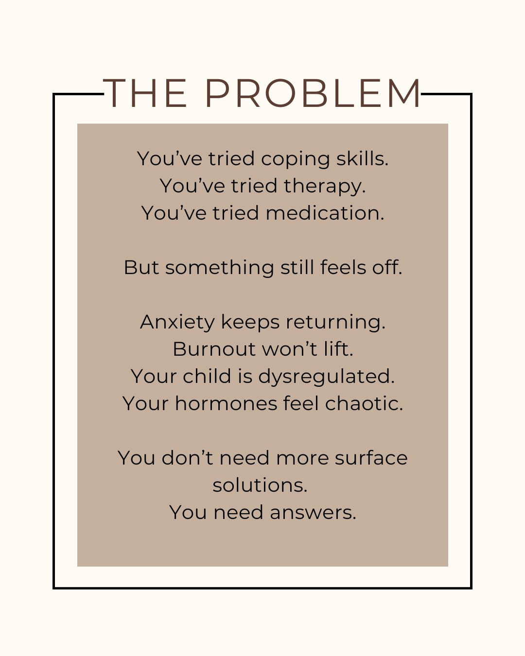 I'm a Licensed Professional Clinical Counselor, Professional School Counselor, Learning Specialist, and a mom of three. I am passionate about helping women and families create non-anxious lives through root cause mental health care.